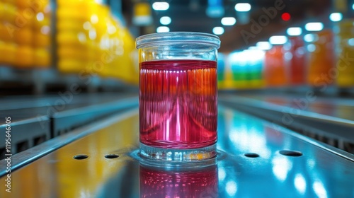 Vibrant Glass Jar of Colorful Liquid Reflected on Metal Surface with Soft Focus Background of Colorful Products in Factory Setting