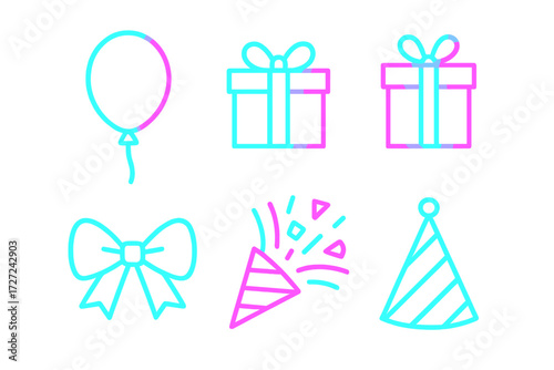 celebration, party, festive, event, gift, balloon, hat, gradient, outline, vibrant, birthday, anniversary, holiday, fun, joy, happy, modern, colourful, bow, present, simple