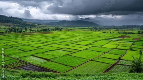 Vibrant Green Agricultural Landscape Under Cloudy Sky