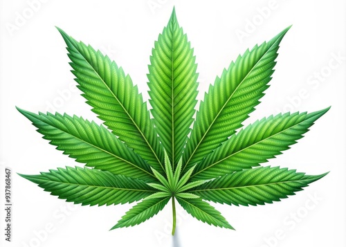 Vibrant green cannabis plant leaf with serrated edges and delicate stems, isolated on white background, showcasing intricate details and textures in stylized vector form.