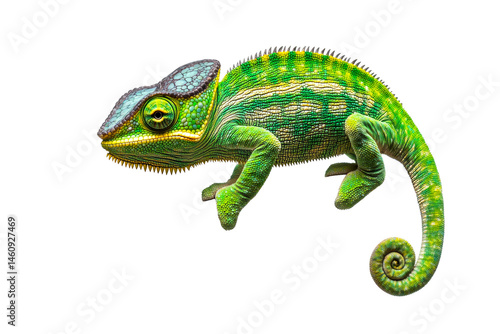 Vibrant green chameleon, detailed scales, isolated, cut out transparent