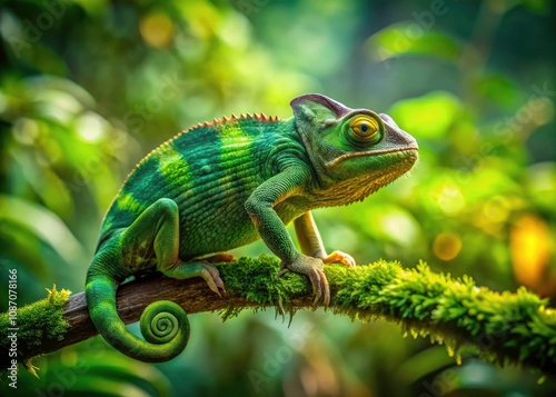 Vibrant Green Chameleon on Branch in Lush Daylight Forest - Nature Photography, Wildlife, Chameleons, Tropical Forests, Colorful Animals, Outdoor Adventure, Flora and Fauna, Biodiversity