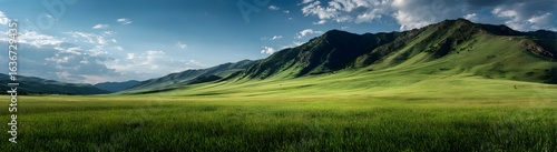 Vibrant Green Grassy Field Rolling Towards Mountain Base