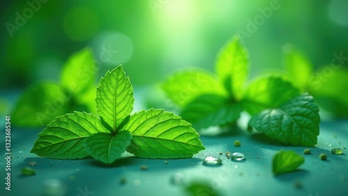 Vibrant Green Leaves Glistening with Dew Drops on a Smooth Surface, a Close-Up Macro Shot Displaying Natural Beauty and Freshness