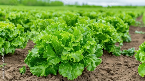 Vibrant green lettuce growing in a field under a cloudy sky, showcasing healthy organic farming practices and rich soil.