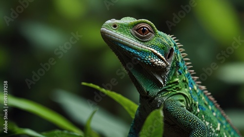 lizzard, reptile, green, iguana, animal, nature, wildlife, tropical, jungle, forest, closeup, portrait, scale, eye, head, detail, skin, exotic, creature, fauna, flora, vegetation, leaf, tree branch, vibrant, colours, bright, beauty, wild, scaly, eye, face, tongue, tail, claw, teeth, habitat, environment, photo, macro, sharpened, sharp, background, texture, pattern, design