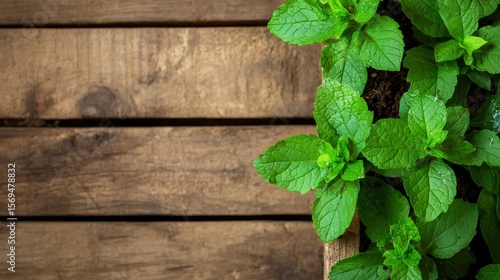Vibrant Green Mint Leaves Growing in a Wooden Box on a Rustic Table Surface