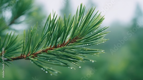 Vibrant green pine needles with glistening dew drops, reflecting natural beauty and the freshness of a lush forest.