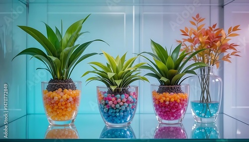Vibrant green plants in clear glass vases filled with colorful gel beads. Perfect for modern home decor, eco-style inspiration, or indoor plant aesthetics.