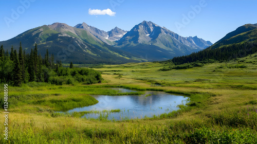 Vibrant Green Valley Landscape With Mountain Peaks Water Reflection and Blue Sky in Sunny Daylight