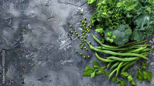 Vibrant Green Vegetables and Herbs on Grey Stone Background