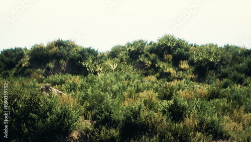 Vibrant greenery covers rolling hills, with various bushes and cacti dotting the landscape. The scene captures a clear, sunny day, highlighting natures beauty and tranquility.