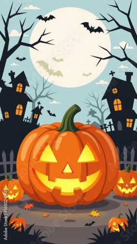 Vibrant Halloween Pumpkin 2D Cartoon scene featuring large, glowing jack-o'lantern with small pumpkins. Concept of Halloween Pumpkin 2D Cartoon celebrates spooky festivities.
