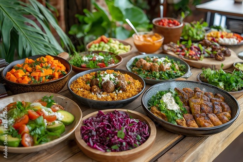 health food, buffet, variety, colourful, fresh, vegetable, salad, sauce, vegetarian, vegan, protein, grain, rice, lentil, bean, herb, spice, catering, event, party, eatery, cafes, dining, nourishment, wellness, lifestyle, delicious, epicure, vibrant, appetising, sharing, community, gathering, abundance, wood table, rustic, natural light, indoor, food photography, healthy eating, balanced diet, culinary, gastronomy, epicure