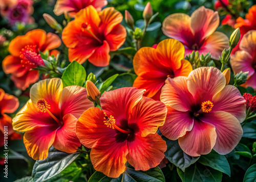 Vibrant hibiscus flowers in a tropical setting showcase a rich palette of reds and oranges in this artistic close-up, exuding warmth and exotic beauty.