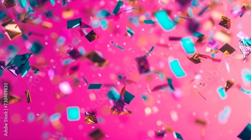Vibrant holographic confetti falling on a bold pink background, generative ai