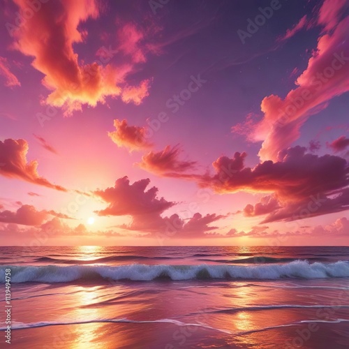 Vibrant hues of orange and pink dance across the sky above a serene ocean, serene landscape , sunset glow, golden light
