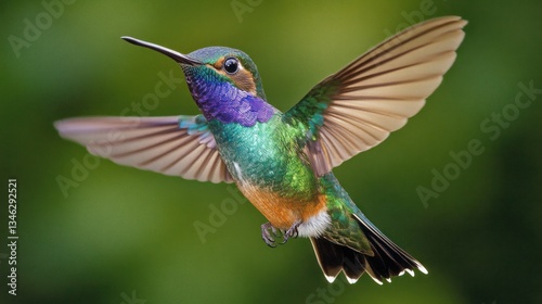 Vibrant hummingbird in flight against a blurred green background. Possible use Nature, wildlife, bird, beautiful, stunning