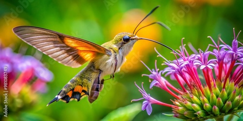 Vibrant hummingbird moth with iridescent wings and long proboscis sips nectar from a tubular flower surrounded by lush