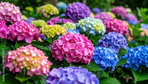 Vibrant Hydrangea Blooms in Vivid Colors Surrounded by Green Foliage