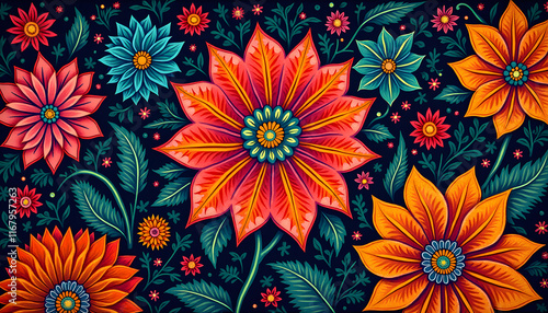 Vibrant Indian Kalamkari Floral Motifs with Dynamic Layers