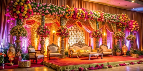Vibrant Indian wedding stage adorned with lush flowers and ornate decorations, set against a warm evening backdrop, awaiting lively dance performances by loved ones.