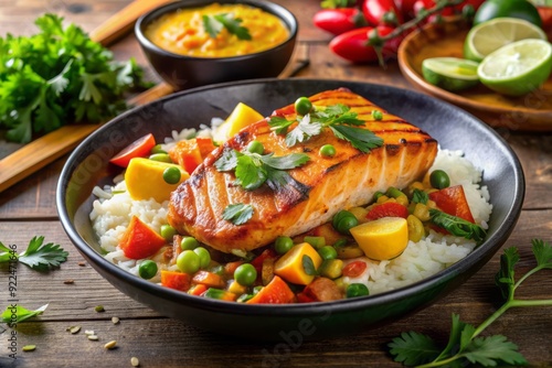 Vibrant Indian-inspired curry dish featuring grilled salmon, mixed vegetables, and fragrant coconut milk-infused jasmine rice, garnished with fresh cilantro and a sprinkle of toasted spices.
