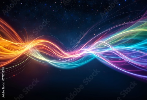 Vibrant intertwined waves of glowing rainbow light streams on dark cosmic background