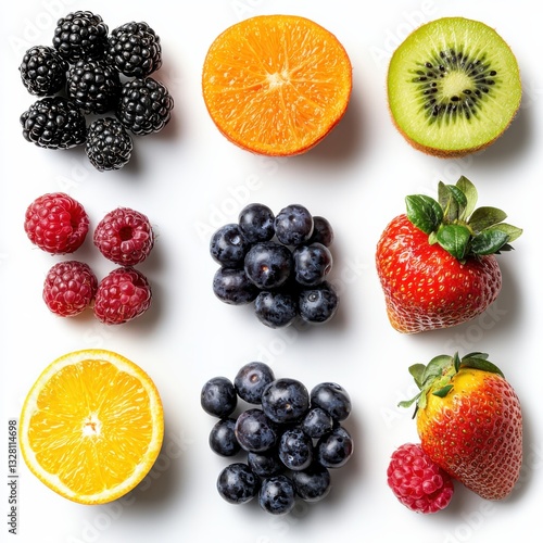 Vibrant isolated fruits display soft daylight photography topdown view on white background colorful arrangement