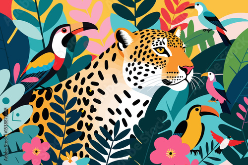 Vibrant Jungle Scene with Leopard-Toucan and Exotic Birds Illustration-Tropical Wildlife Art-Colorful Nature Painting-Jungle Animal Artwork-Whimsical Art