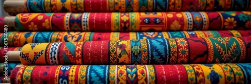 Vibrant kente cloth rolls on display at African market stall, textile, traditional