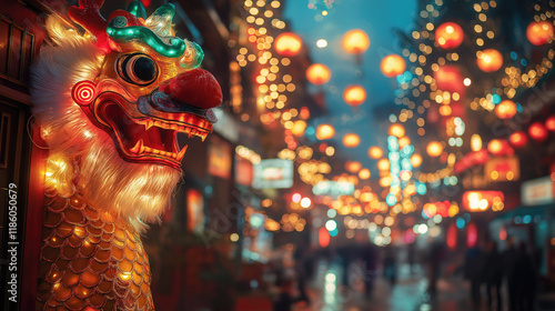 Vibrant lantern festival with illuminated dragon in bustling asian street. Chinese New Year