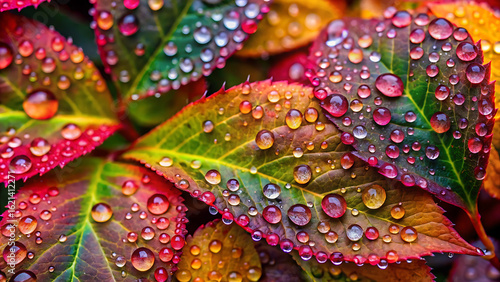 Vibrant Leaves Covered in Water Droplets Close Up