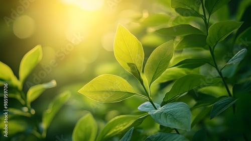 Vibrant leaves on a sunlit plant, showcasing bright green foliage and lush botanical detail in a serene garden setting with natural light and organic textures.