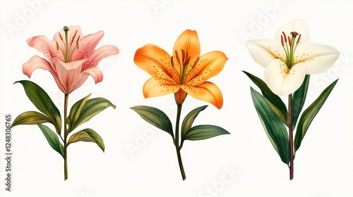 flower, lily, blossom, pink, orange, white, botanical, art, floral, nature, elegance, beauty, green, leaf, plant, traditional, garden, decorative, natural