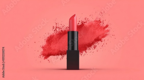 Vibrant lipstick with splash of red powder against soft pink background