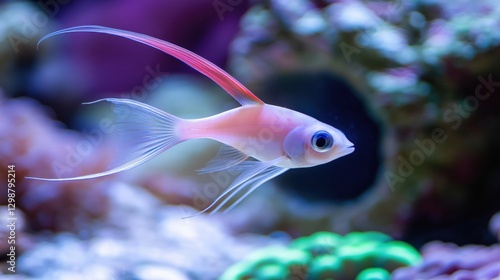 Vibrant lyretail anthias swimming gracefully in lush coral reef environment