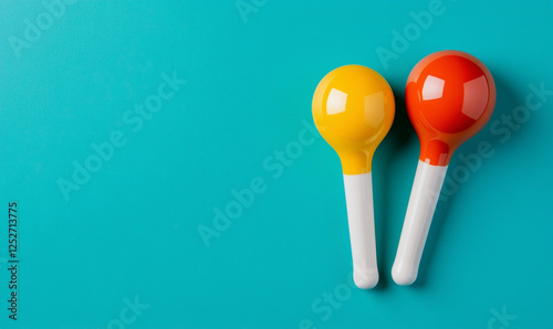 Vibrant maracas in yellow and red on a bright blue background, perfect for musical themes.