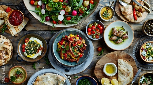 Vibrant Mediterranean Mezze Spread with Various Dishes on Rustic Wooden Table