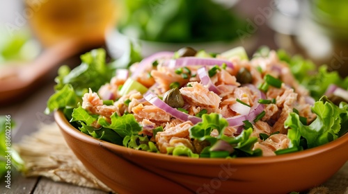 Vibrant Mediterranean-Inspired Tuna Salad, A Nutrient-Rich Fusion of Omega-3s, Crisp Vegetables, and Zesty Capers for Wholesome Living.