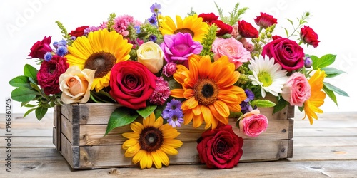 Vibrant mix of colorful blooms, including roses, daisies, and sunflowers, spill out of a distressed vintage wooden crate against a soft, creamy white background.