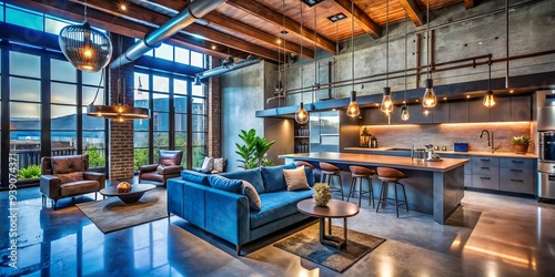 vibrant modern residence fusion gleaming copper wiring exposed industrial chic renovation electric blue accents steel beams polished concrete floors dramatic nighttime lighting