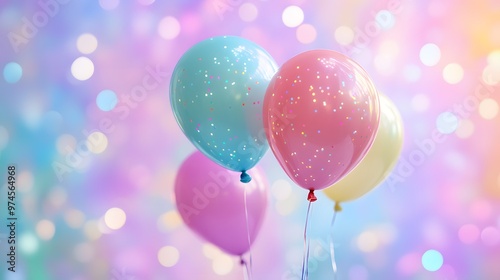 Vibrant multicolored balloons against a pastel rainbow background, showcasing glossy reflections and a celebratory mood, creating a whimsical atmosphere perfect for festive occasions.