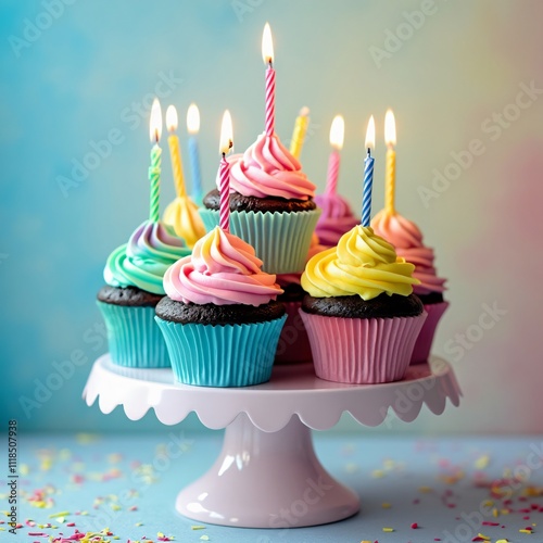 Vibrant Multicolored Birthday Cupcakes on Pastel Pedestal, Whimsical Festive Treat