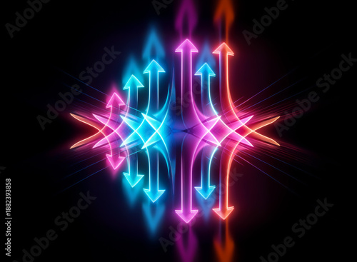 Vibrant neon arrows ascend, curving upward in a dynamic display against a stark black background, reflecting on a glossy surface, symbolizing growth and progress.