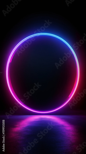 Vibrant neon circle illuminating dark space, casting reflections on wet asphalt, creating a futuristic and atmospheric scene