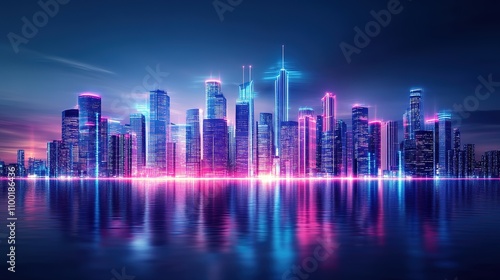 Vibrant Neon Cityscape at Dusk with Reflections in Water