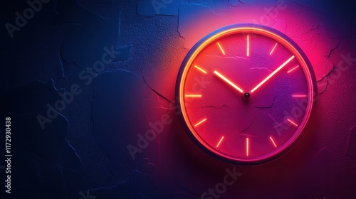 Vibrant neon clock casting mesmerizing red pink and purple light in a contemporary minimalist interior setting The digital or analog timepiece creates a striking