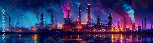 oil, refinery, industrial, night, scene, neon, colours, vibrant, illuminated, energy, pollution, plant, factory, skyline, futuristic, technology, glowing, light, urban, city landscape, petrochemical, production, atmospheric, digital, art, complex, smog, colourful, contrast, landscape, industrialization