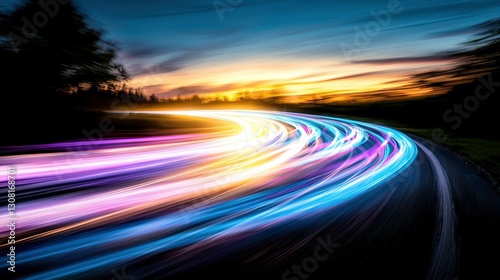 vibrant neon highway at night, showcasing dynamic light trails and stunning sunset